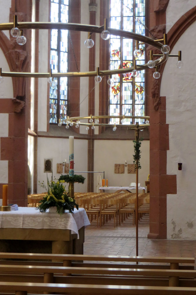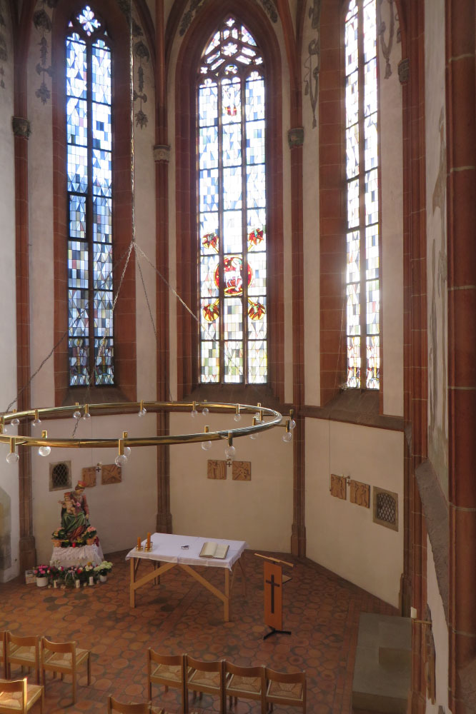 Der Chorraum ist der älteste Teil unserer Heilig Geist-Kirche. Er entstand im frühen 14. Jahrhundert, gehört also in die Zeit der Gotik. Ein wesentliches Kennzeichen der Gotik ist ihr Zug nach oben. Den können wir auch in unserer Kirche wahrnehmen: Aus einer verhältnismäßig kleinen Grundfläche heraus schießen die Wände weit in die Höhe. Das ist ganz bewußt so gestaltet. Denn diese Architektur will den Blick, die Gedanken und die Empfindungen des hier betenden Menschen nach oben, zu Gott hin ziehen. Und zudem können in dieser Bewegung nach oben die großen Fenster des Chorraumes seiner Seele ein Fenster aufschließen, durch das er betend den Himmel ein wenig offen sehen kann.
