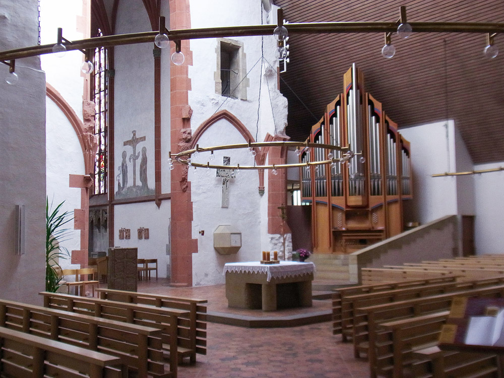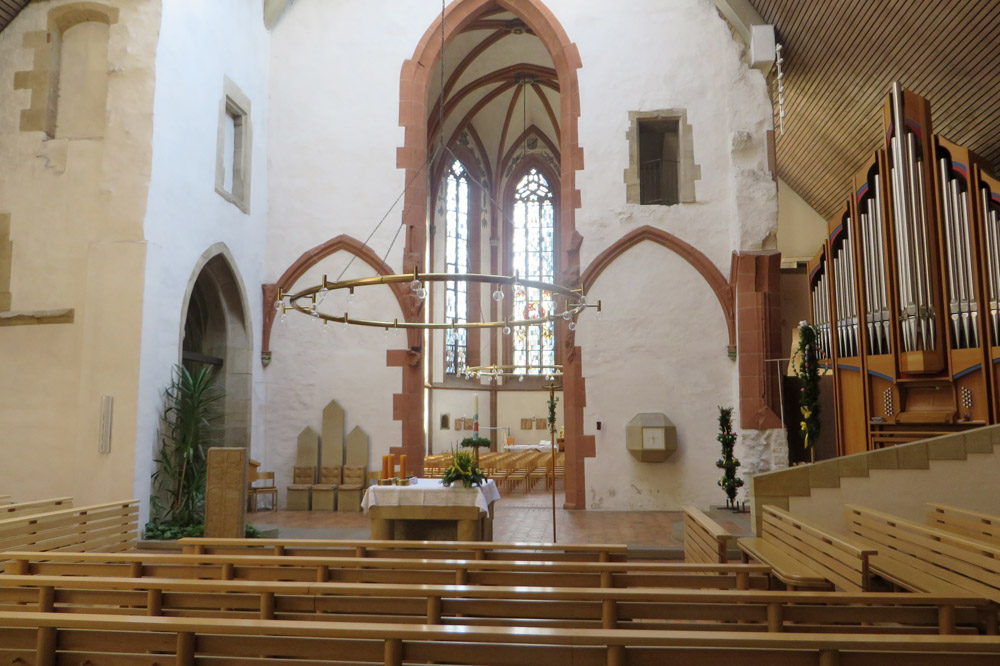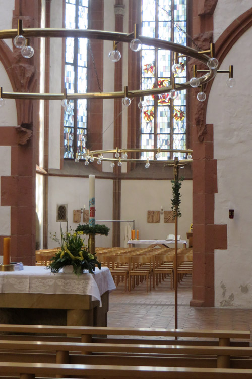 Die Bänke sind in drei Blöcken um den Altar gruppiert, an dem die Eucharistie gefeiert wird. So zeigt der Kirchenraum sich ausgerichtet auf die geistige Mitte, um die sich die Gemeinde als das Volk Gottes versammelt. Unterstützt wird dieser Gedanke durch die im Kirchenraum konzentrisch im Halb- und Vollkreis angeordneten Radleuchter. Auf den Stufen vor der Orgel hinter der Mauer stellen sich Musikgruppen für den Gottesdienst auf.
