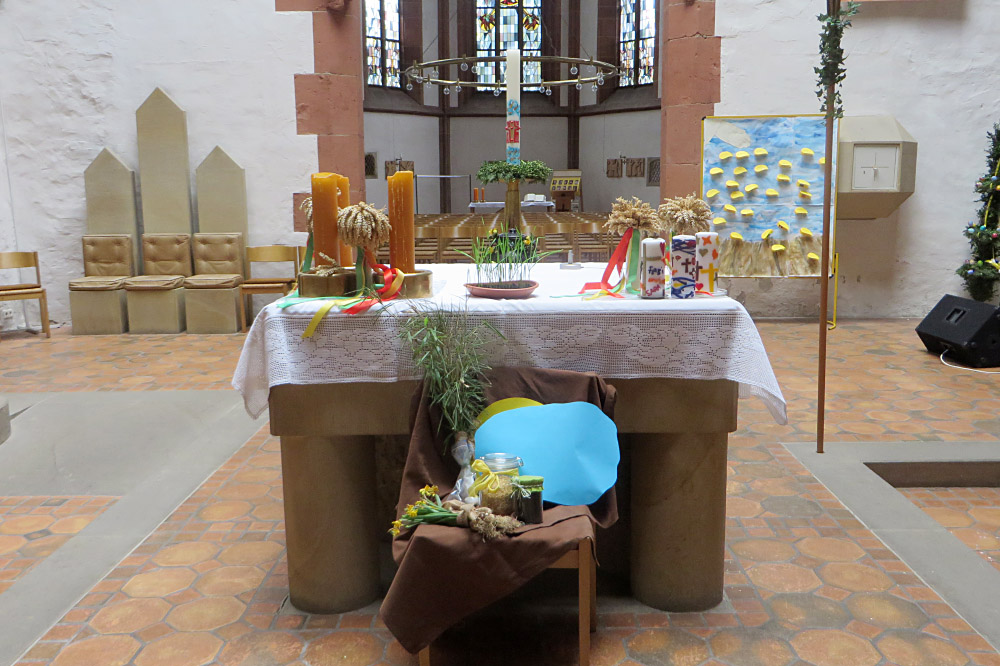 Der Altar, der die Entwicklung vom alttestamentlichen Opferaltar zum neutestamentlichen Abendmahlstisch zeigt.Hier, von vorne, ist der Altar als Tisch zu sehen, von der anderen Seite, blockhaft, als Opferstein.