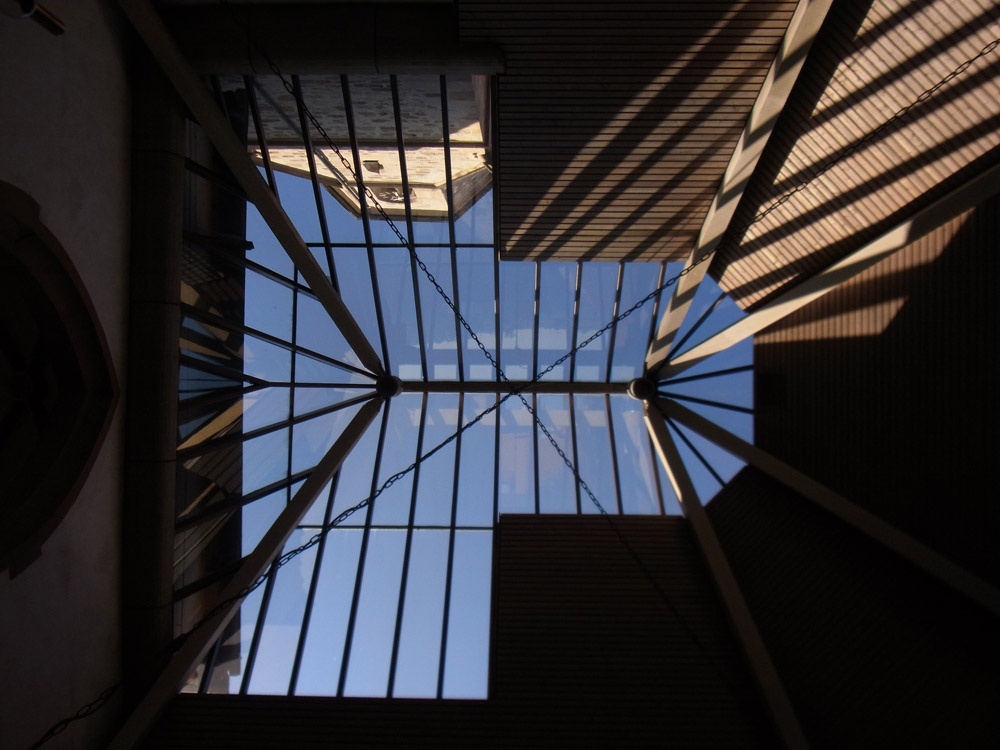 Glasdach über dem Altar: Der Höhepunkt des modernen Ausbaus: Das Glasdach, durch welches das Licht von oben in den Kirchenraum strömt.