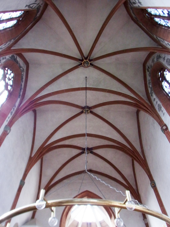 Blick in den Chorraum mit Kreuzweg und gotischen Fenstern. (14. Jhd.) und Decke über dem Chorraum, ein Kreuzrippengewölbe mit Schlußstein