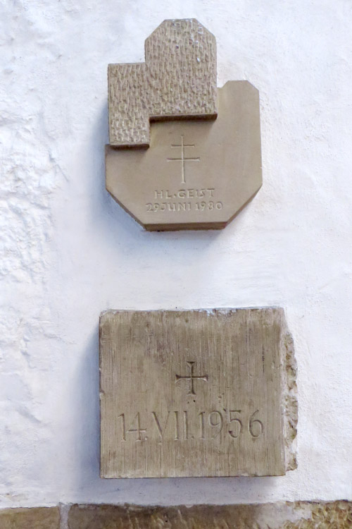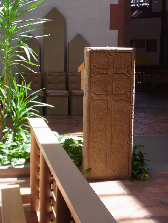 Der Ambo: Die Steinplatte des Ambo mit dem Kennzeichen des Spitalordens, der vom 13. bis Mitte des 16. Jhds. Träger des Hl. Geist-Spitals in Markgröningen gewesen ist, dem Spitalkreuz.