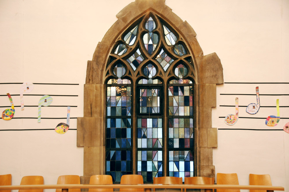 An den Enden des Dachfirstes die beiden Schlußrohre (anstatt der mittelalterlichen Schlußsteine).Das Glasdach als offener Himmel. Angebracht über dem Altar zeigt dies,