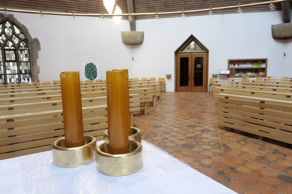Ein erster Eindruck: Der Blick geht über quadratisch und rechteckig geformte, aus rötlich braunem Ton gebrannte Bodenplatten im Inneren des neu angebauten Kirchenraumes, in dessen Zentrum der Altar steht.